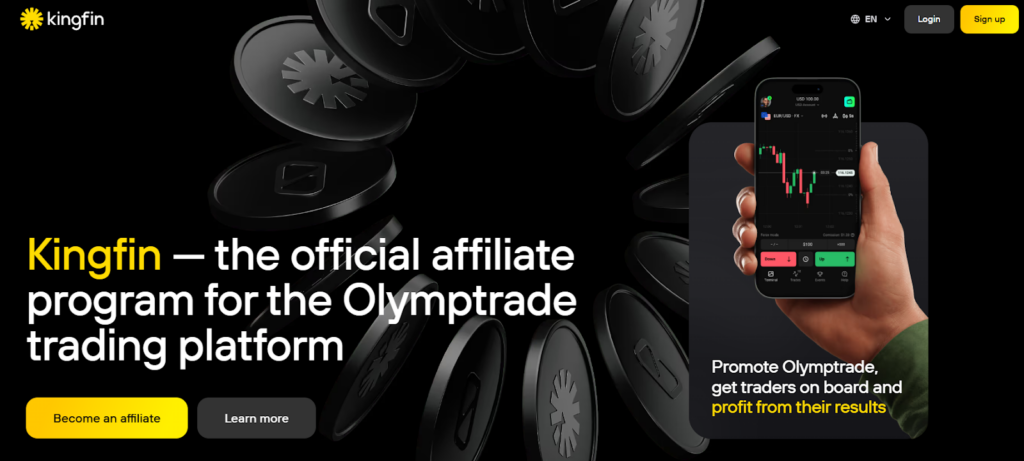 The Kingfin platform is a reliable and modern affiliate network offering direct cooperation with the exclusive Olymptrade offer to marketers.
