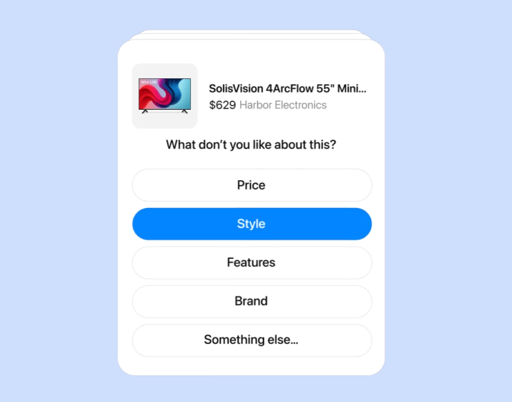 Users can also refine results in the process: mark items as “Not interested” or “More like this”, ask for alternatives, or narrow down by price, brand, or features.