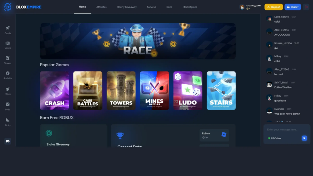 In most cases, users fund an account, receive internal coins or balance, and use that to access games like cases, crash, or dice. Winnings stay inside the platform until they’re withdrawn as Robux, crypto, or other supported rewards.