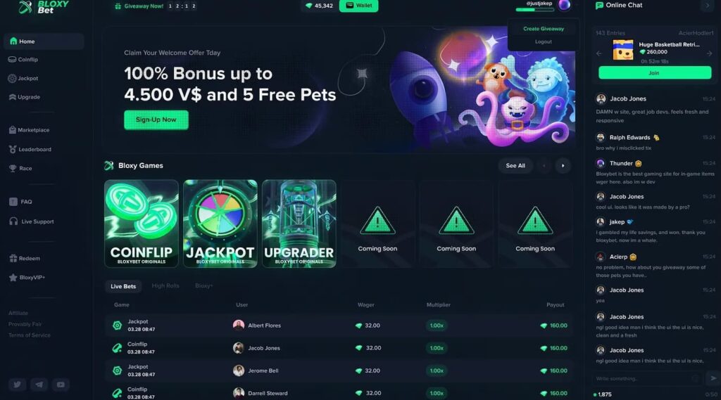 Bloxybet is a site that’s all about bringing together case opening and classic gambling — an “all-in-one” experience. In contrast to BloxGame, it’s for those who love trying out lots of different options rather than just speed
