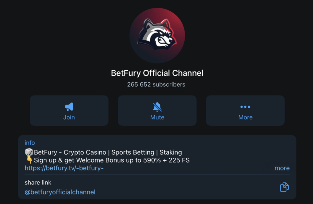 BetFury is a well-known crypto casino that’s been using Telegram bots and channels to reach out to users for a while now. The bot doesn’t actually run the full casino inside chat, but it does give you a quick way to get into the platform, and also lets you get notified about any bonuses or promotions that come up.