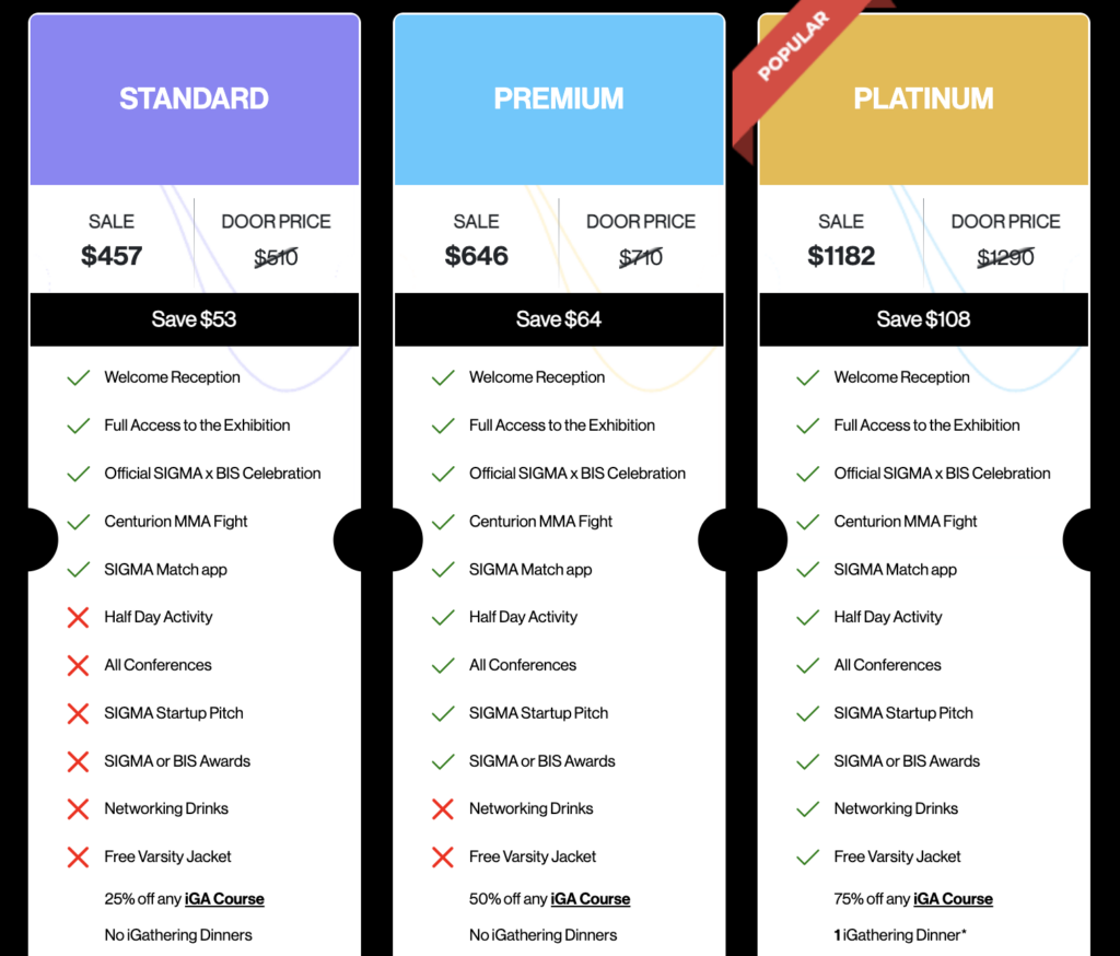 Tickets for SiGMA South America 2026 are divided into three tiers: Standard, Premium, and Platinum.