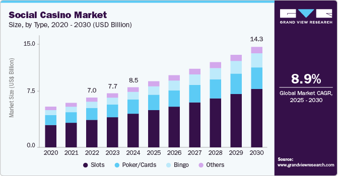 The figures are also impressive—according to a Grand View Research report, social casino gaming market revenue was 8.4 billion dollars in 2024, and it can reach 14.3 billion dollars by 2025.