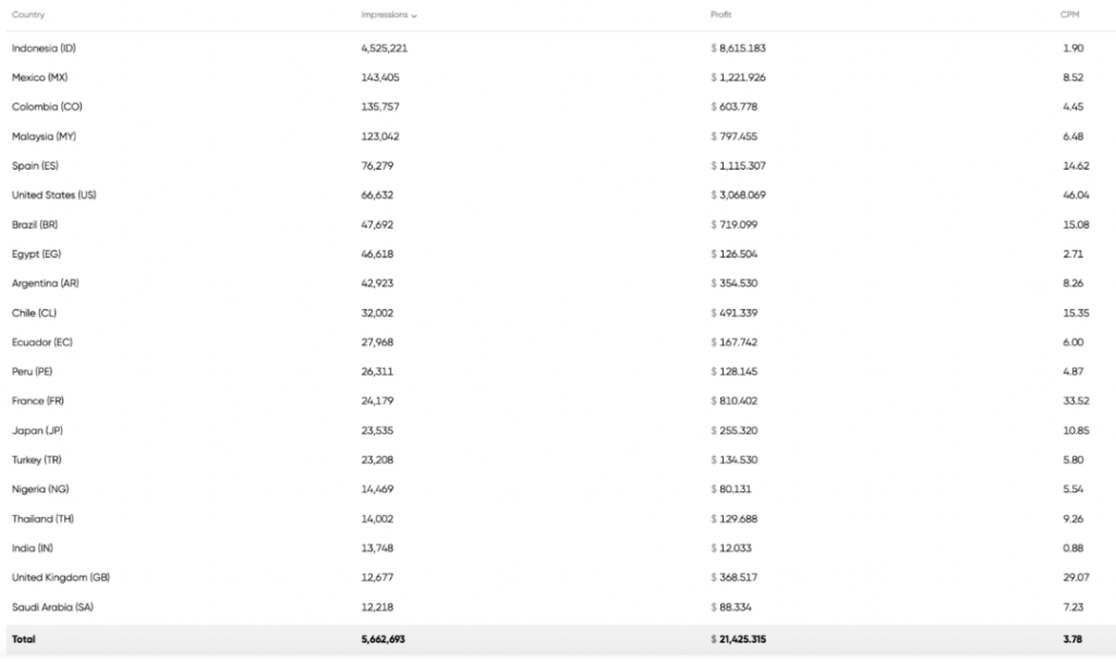 He uses AI to translate content into multiple languages and reach multiple regions. GEO data helped him refine his approach: Indonesia drives the highest volume, while countries like the United States, France, the United Kingdom, and Chile deliver higher CPMs even with smaller traffic. This directly impacted how he organised and scaled his accounts.