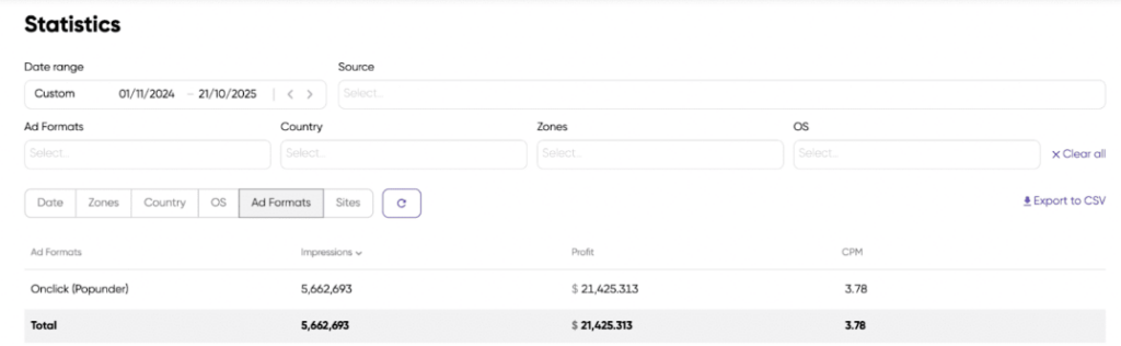 He uses Monetag SmartLink (shown as OnClick in the stats)