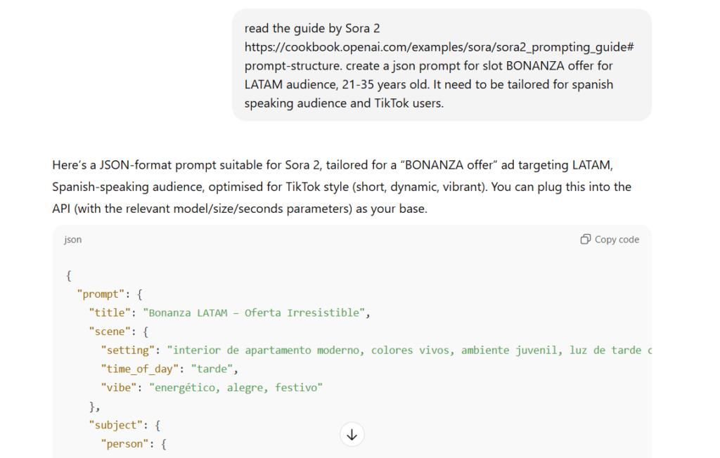 You can generate creative ideas yourself, then upload them to Chat GPT and ask to convert them into more understandable JSON format for the model or ask the Chat to read Sora 2 guide, and generate the prompt for your exact GEO, audience, format and offer.