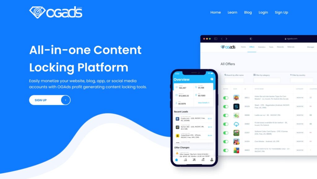 OGAds is an affiliate network with content locking that works via CPA, CPL, CPS, CPI pricing models. The platform will definitely suit those affiliates who have mobile and desktop traffic. OGAds will help you earn money by promoting iOS and Android apps, content surveys and downloads.