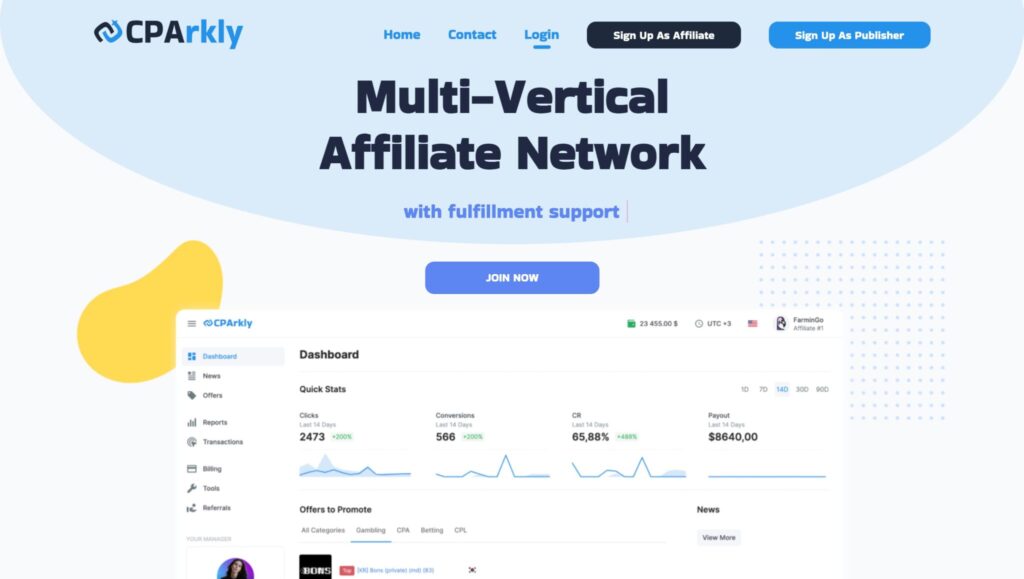 CPArkly is a multi-vertical affiliate network. The platform prioritizes such verticals as Betting, Gambling, Nutra/Health, etc. Affiliates have access to more than 150 offers from 100+ direct advertisers.